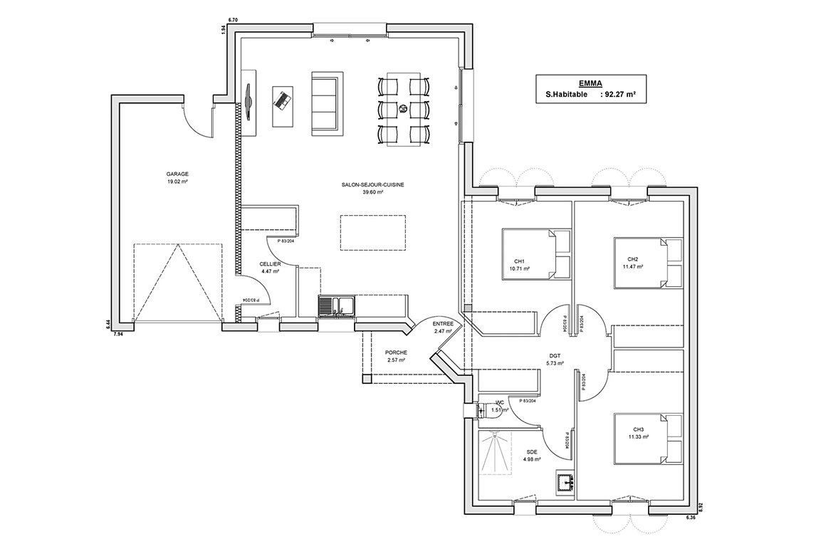 Originale avec sa façade décalée et son porche, le modèle Emma, d’une surface habitable de 92 m² offre 2 modules bien distincts qui accueillent 3 chambres avec une grande salle de bains pour l’espace nuit et une cuisine ouverte avec cellier donnant sur un grand salon pour l’espace jour.