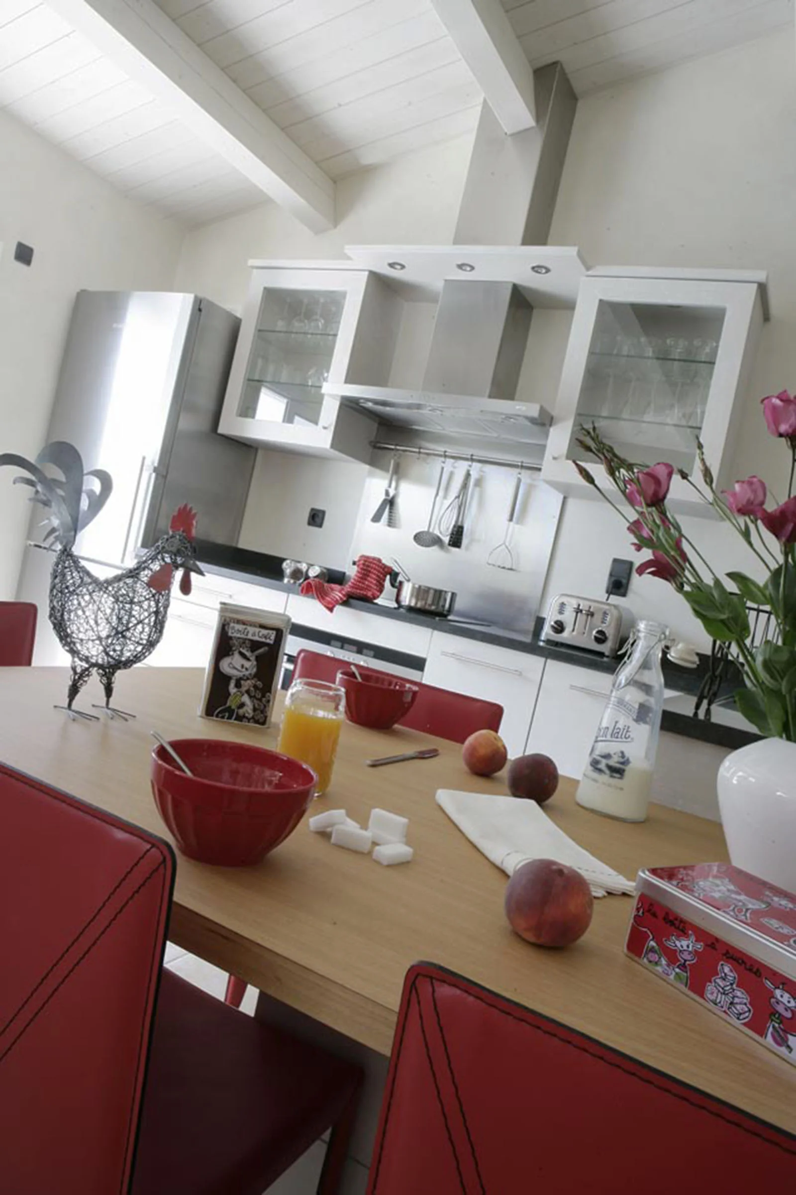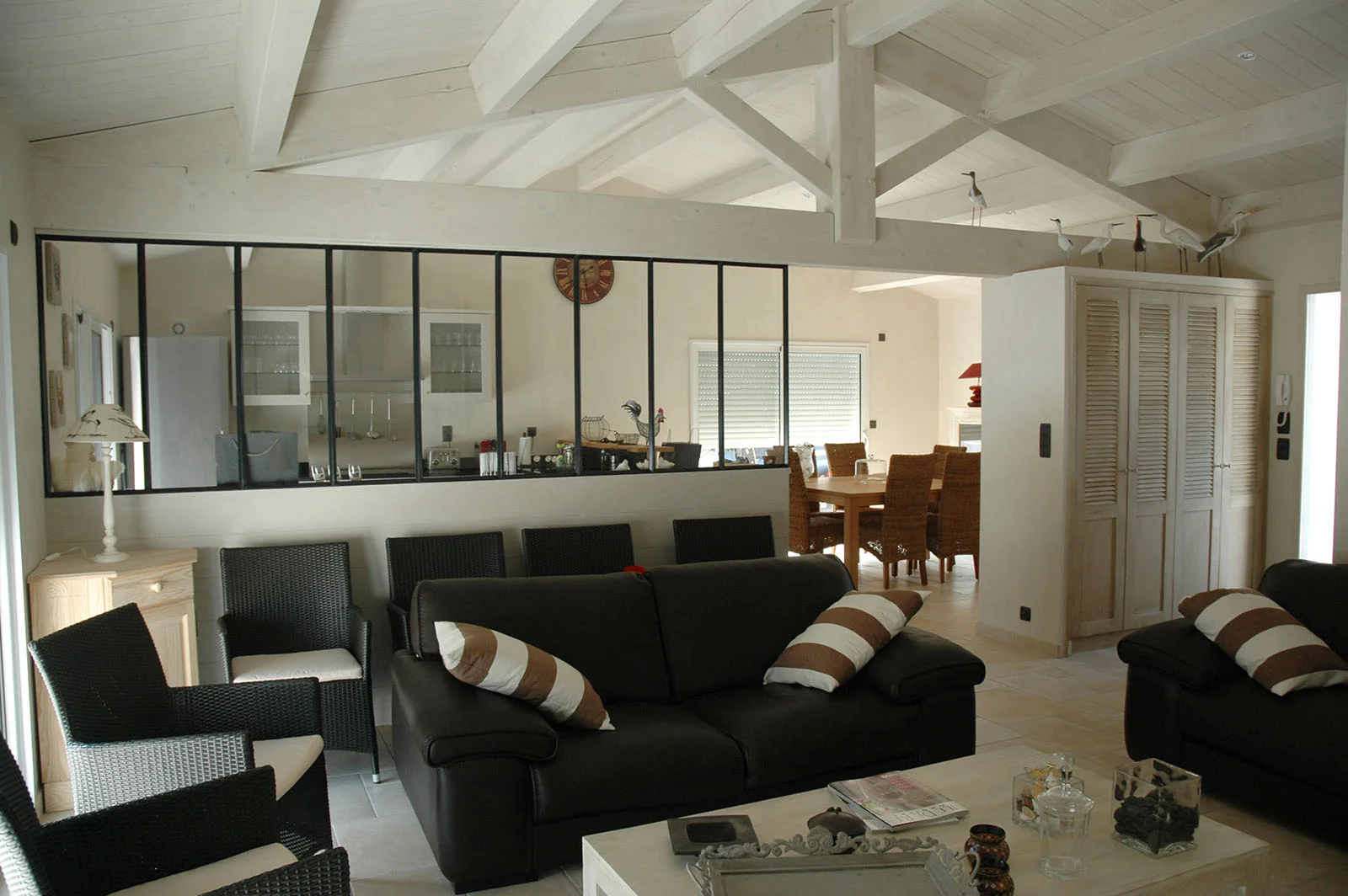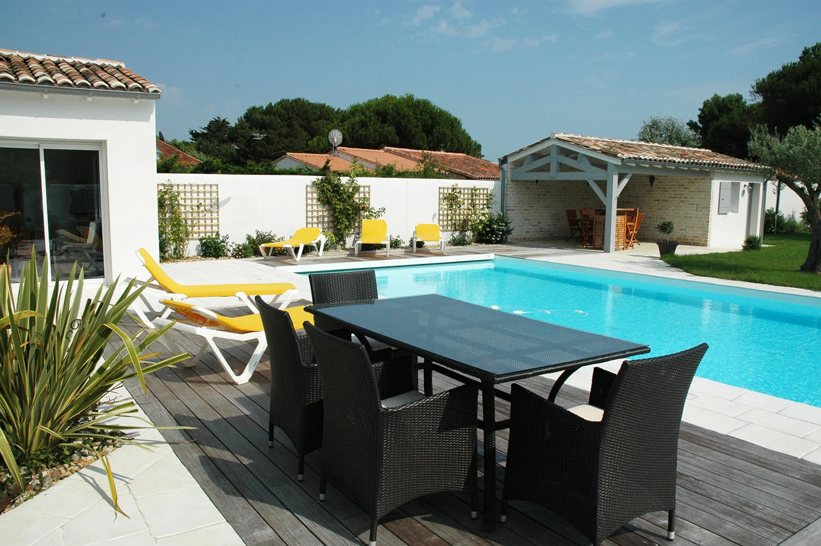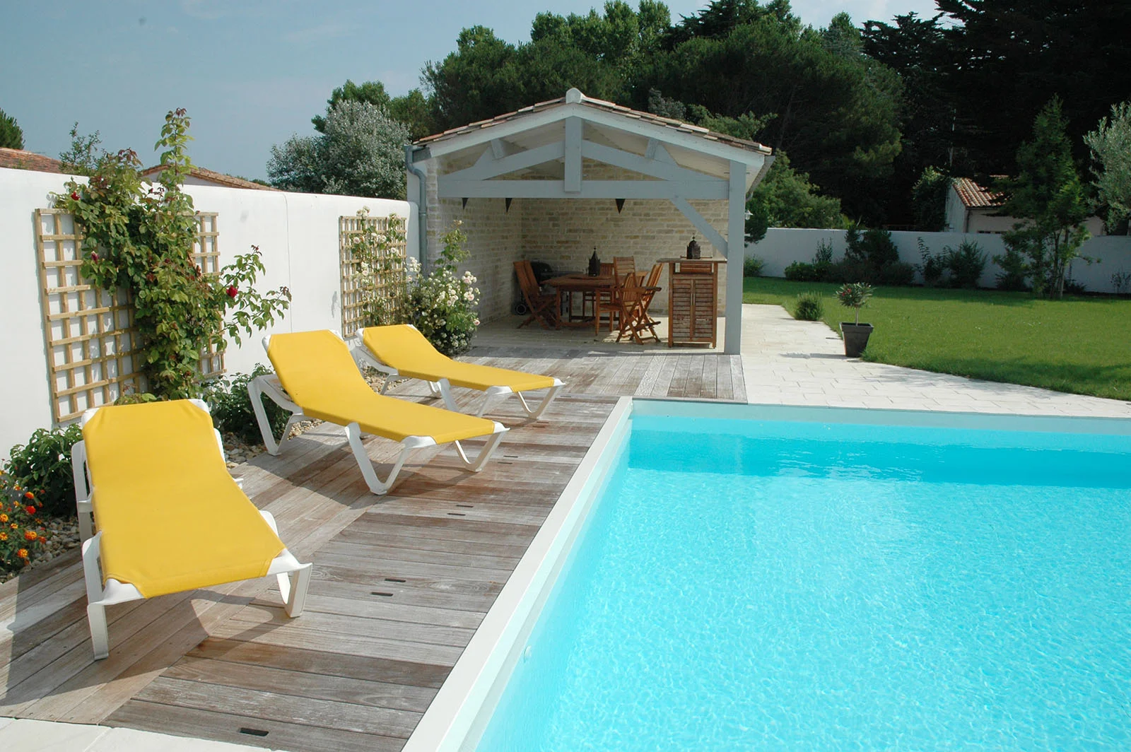 La résidence secondaire 6 pièces de Pierre & Annabelle. Maison rétaise non loin de la plage et de son marché local au Bois Plage en Ré, cette maison de 145 m² dispose de 4 chambres, d’un beau salon en charpente traditionnelle avec une cheminée charentaise. Grand terrain de 990 m² avec piscine. Conforme à la RT 2012.